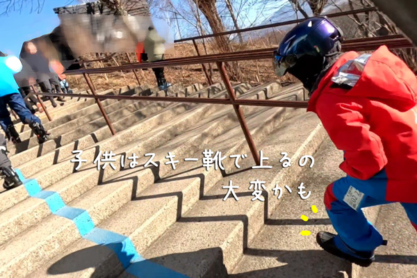 だって、この階段あがらなくちゃいけないから!スノーシューズで正解でした